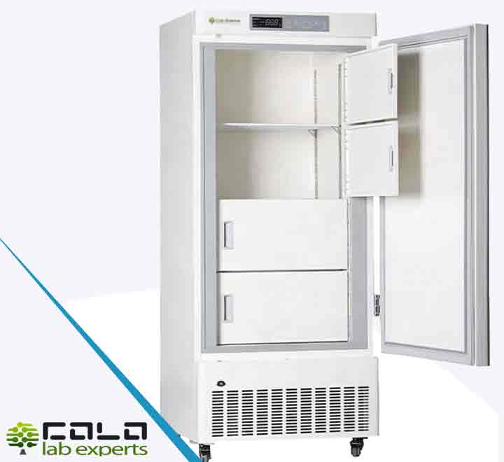 Vertical low temperature freezer family for controlled laboratory storage with microprocessor control, LED display, R290 direct refrigeration, 0.1°C temperature accuracy and USB temperature logger support. COLO.Science · Practical and robust equipment for everyday laboratory workflows.